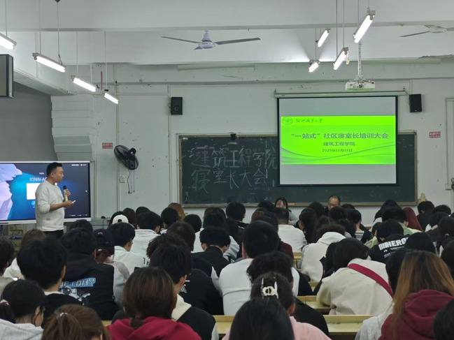为进一步筑牢学生宿舍安全防线,规范宿舍管理秩序,营造整洁、和谐、文明的住宿环境,2025年11月13日,建筑工程学院在“一站式”社区举行寝室长大会暨文明寝室活动启动大会。建筑工程学院党总支书记陈建刚、建筑工程学院党总副支书记吴英凯、学院专兼职辅导员及全院150余名寝室长参加了本次会议。