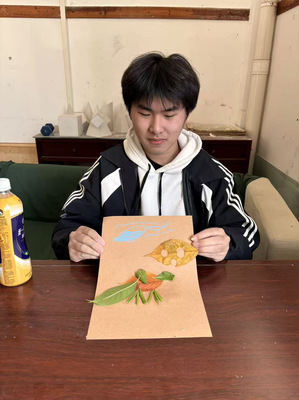 拾叶环节圆满结束后,同学们带着满载的“秋日宝藏”齐聚学院活动室,投入创意作画环节。大家充分发挥想象力与动手能力,将不同形状、色彩、纹理的秋叶作为创作素材,通过拼贴、组合、点缀等方式精心构思。有的以枫叶为羽,勾勒出翩跹起舞的蝴蝶,寓意青春活力;有的用银杏叶层层叠叠,还原出“霜叶红于二月花”的秋日盛景,尽显自然之美;还有的巧妙搭配叶片形态,创作出生动可爱的卡通形象与简约雅致的装饰画,每一幅作品都独具匠心、充满巧思。创作过程中,成员们相互支招、彼此协助,遇到构图难题时共同探讨,灵感在交流中碰撞,友谊在协作中升温,活动室里始终洋溢着轻松融洽的氛围。
