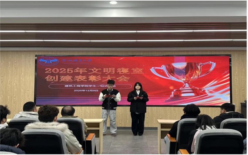 为进一步深化校园文明建设,营造整洁有序、互助友爱、积极向上的宿舍育人环境,充分发挥学生寝室的育人功能,鄂州职业大学建筑工程学院“一站式”社区于2025年12月9日16:00在实训场报告厅隆重举行文明寝室表彰大会。建筑工程学院党总支书记陈建刚、建筑工程学院全体辅导员、建筑工程学院宿舍管理委员会全体学生干部及全体获奖寝室成员、班长代表参加了本次大会。