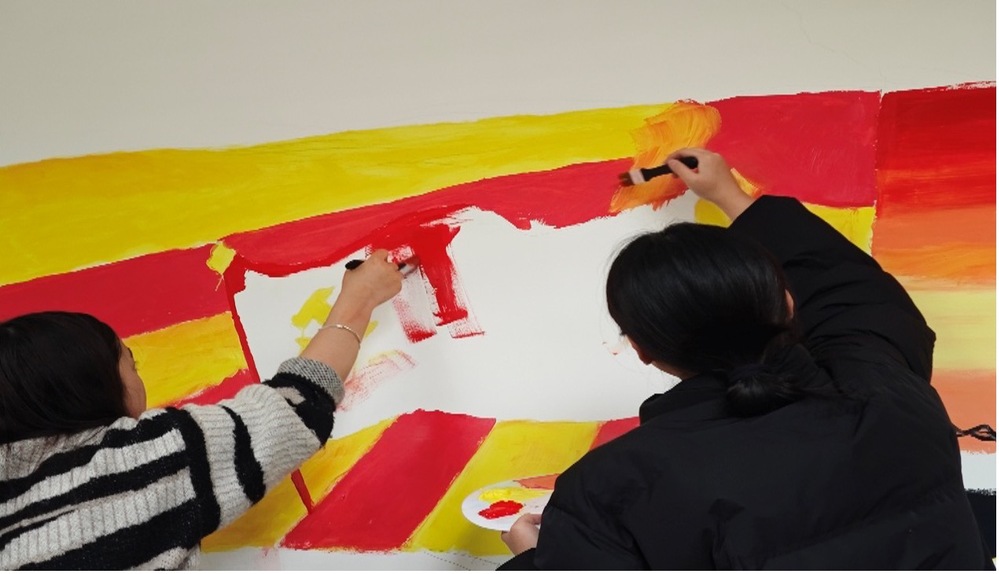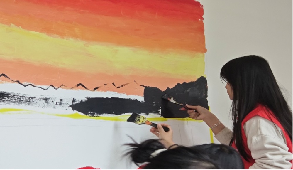 活动当天,办公室内洋溢着热情与创意。同学们分工协作,有的勾勒轮廓,有的调配色彩,有的填充细节。从清晨到日暮,原本素净的墙面逐渐被温暖的色调与生动的画面覆盖。绘画过程中,大家不时交流构思、互相协助,一笔一划间不仅展现了艺术才能,更体现了社团成员之间的默契与凝聚力。