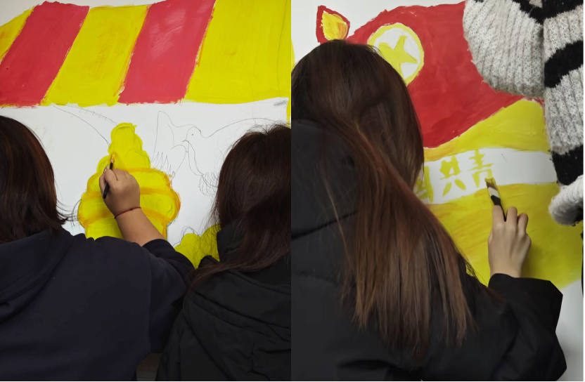 活动前期,在社区的倡导下,社团成员围绕“奋斗”“团结”“成长”等主题展开热烈讨论,共同构思墙绘内容,最终确定了以“共产主义青年团”与“祖国”为核心元素的创作方案。