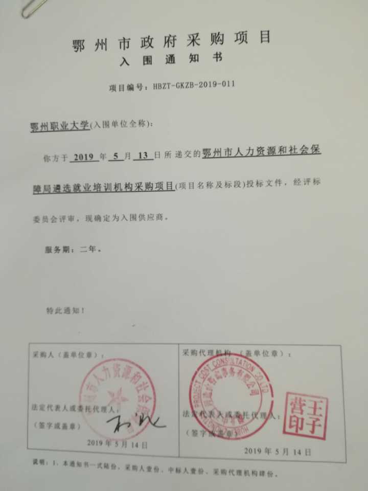 2019 年5月14日 我校培训鉴定中心收到湖北中天工程造价咨询事务有限公司代理鄂州市政府采购项目中标通知书(中标编号:HBZT-GKZB-2019-011),我校中标鄂州市就业培训定点机构,项目服务周期为2019.6.1--2021.5.31。