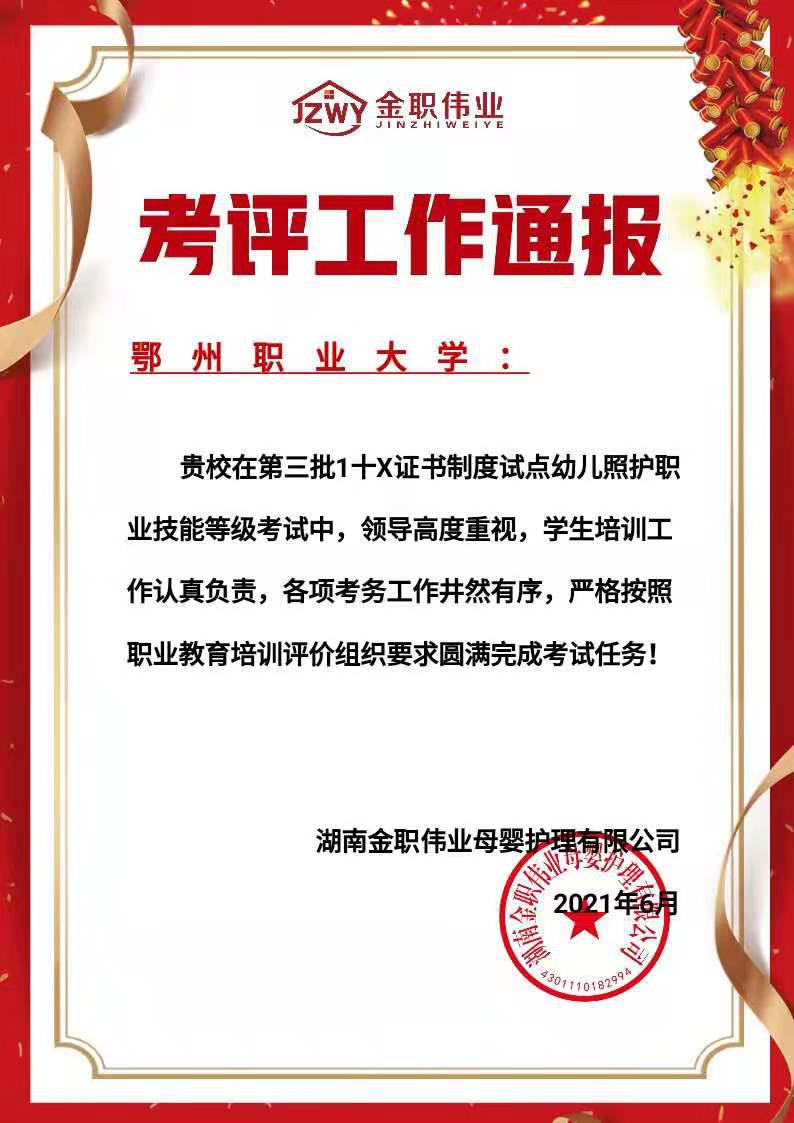 幼儿照护证书培训考试中,由于培训工作认真负责、考务工作井然有序、严格按照评价组织要求圆满完成考试任务,被湖南金职伟业母婴护理有限公司通报嘉奖。