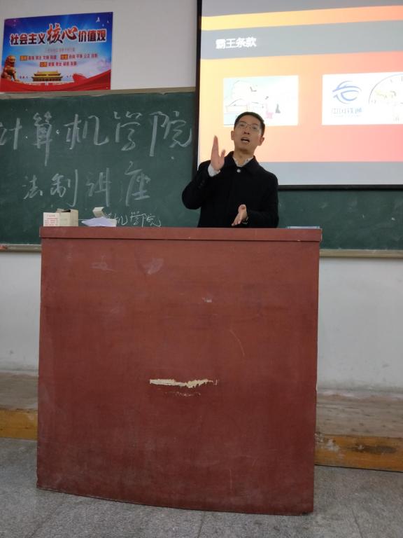 2017年12月19日晚,我院在三号教学楼E610开展了以“人人懂法 人人守法”为主题的法制知识讲座。本次讲座荣幸地邀请到鄂州市中级人民法院刘法官为我们主讲,我院16级、17级学生班干部参加此次活动。