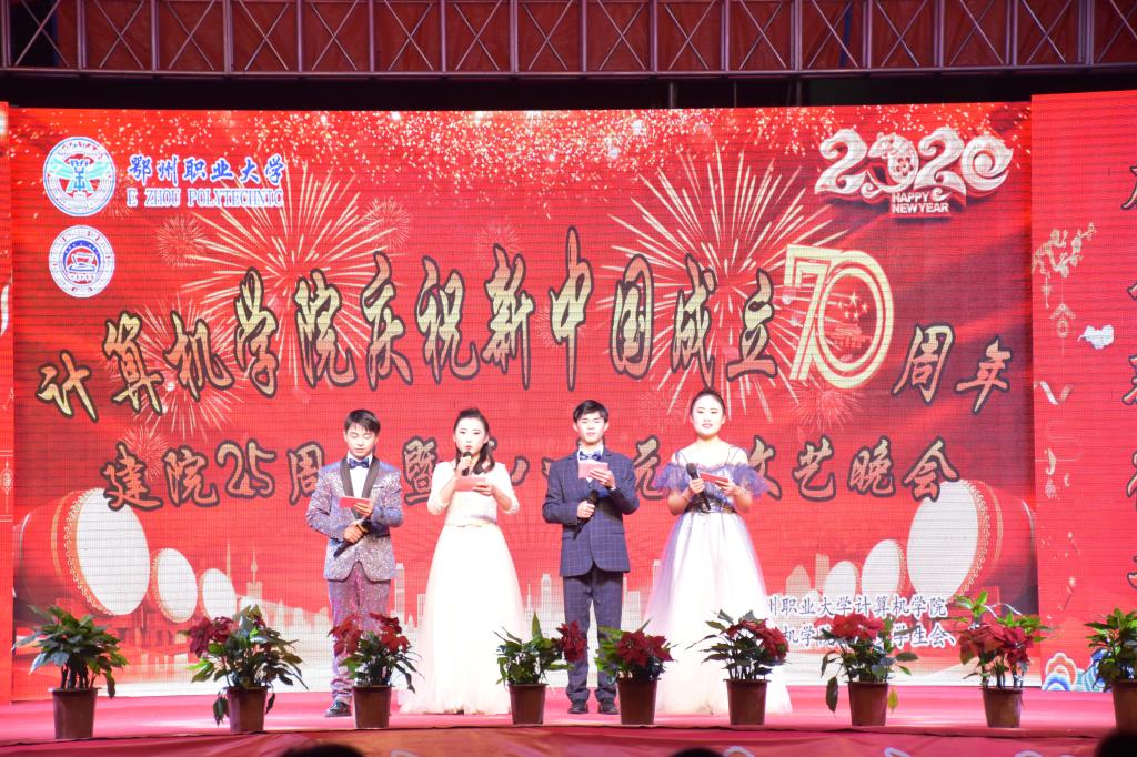2019年12月23日18:30,由计算机学院主办、团总支学生会、宿管会承办的鄂州职业大学计算机学院庆祝新中国成立70周年、建院25周年暨第八届元旦文艺晚会在主教学楼前广场前隆重上演。筑梦新时代,奋斗新征程。十六个节目各具特色,形式多样,展现了我院学子青春风采和精神风貌。鄂州职业大学党委委员、副校长杨殿生、学工处处长陈永红、副处长王冠华和计算机学院师生共同出席了本场晚会。