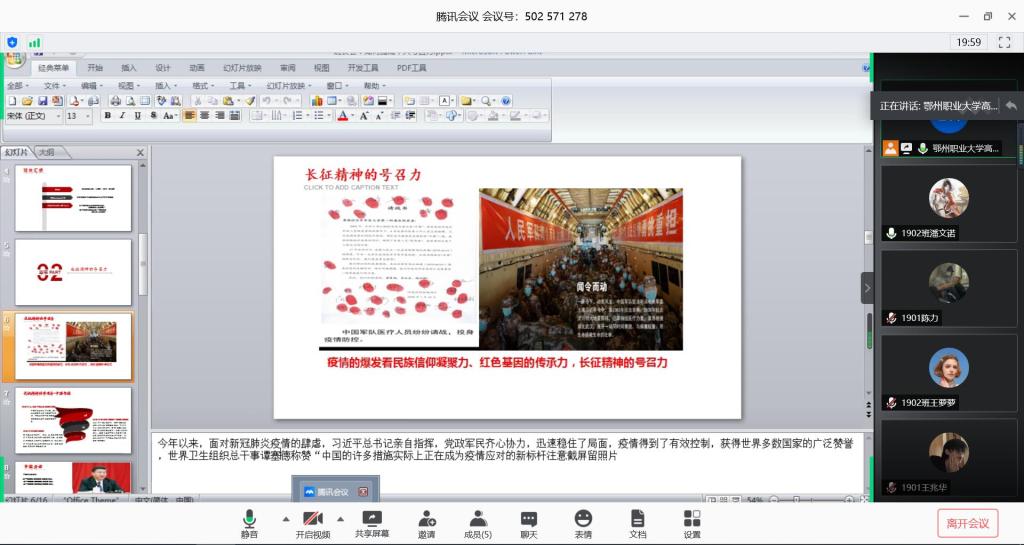 首先由各位班长对本学期工作的汇报,见识长征精神的号召力,作为班上领头羊如何提高号召力。1901班和1902班两位班长分别汇报了班级关于5月工作,包括出勤率、课前六分钟、moot观看、预习笔记、课堂笔记提交统计、线上上课互动情况,比较客观的反应了目前本班的真实情况,有针对性的对于班级的突出问题提出了切实可行的相关办法。
