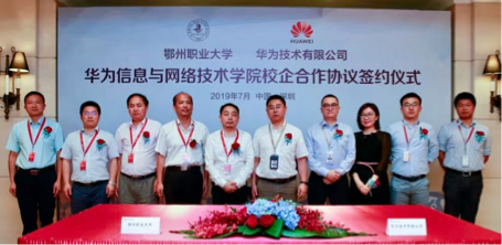 2019年7月10日,鄂州职业大学与华为技术公司就培养ICT优秀人才合作事宜达成一致,在深圳华为技术公司总部正式启动签约仪式,在鄂州职业大学周峰校长和华为技术有限公司企业业务部马毅部长的共同见证下,计算机学院院长肖力与华为技术有限公司中国企业培训与认证部校企合作总监蒲金波签订华为信息与网络学院校企合作协议。华为技术有限公司中国企业培训与认证部校企合作总监付琳琳、蔡尹楚,企业业务部教育/医疗湖北行业代表罗辑、马超,武汉科云信息技术有限公司(华为湖北教育行业优选合作伙伴和华为认证授权培训中心(HALP))总经理邓太勇、鄂州职业大学计算机学院党总支书记袁开明、实训中心副主任张光亚参加了签约仪式,这标志着我校与华为技术公司校企深度融合、共建鄂州职业大学华为ICT学院工作正式启动。