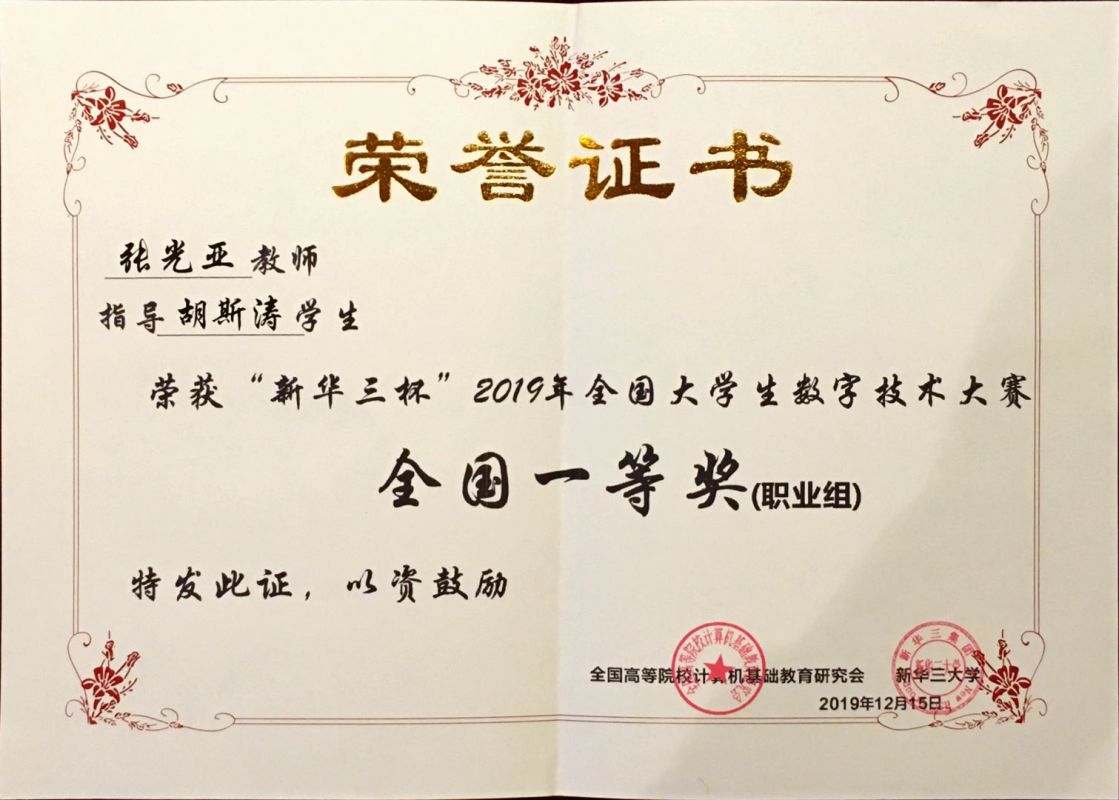 12月15日,由全国高等院校计算机基础教育研究会和新华三集团联合主办的第九届“新华三杯”全国大学生数字技术大赛全国总决赛在杭州落下帷幕。计算机学院2017级H3C网络工程师特色班学生胡斯涛喜获全国一等奖,指导老师张光亚被评为优秀指导老师。