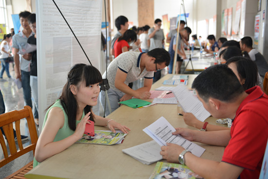本网讯(学生记者陈敏、黎冬梅、缪小艳、王雅秋、李琴/文周楚明/摄)为服务学生就业,6月6日上午,我校在图书馆举行2014校园大型招聘会。前来招聘的125家企事业单位,主要来自武汉城市圈、长三角、珠三角经济区和东北、东南沿海城市,其中不乏世界500强、中国500强、世界行业100强企业等国有全资、中外合资、台资、外资企业或海外上市公司,提供医药、精工、电子、教育、金融、地产、服务等多个行业领域的岗位3800多个。