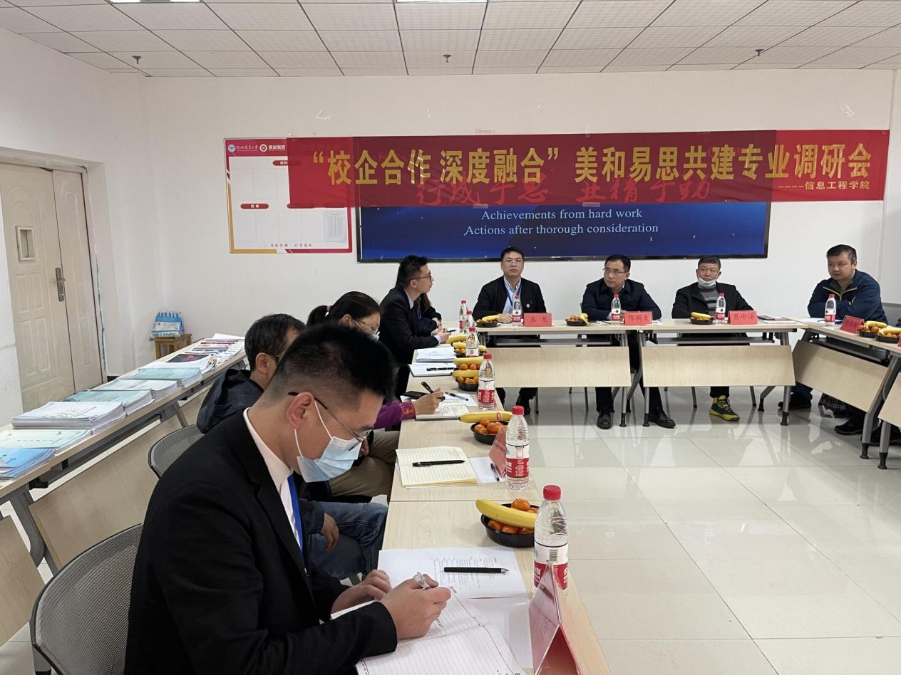 调研过程中学院领导和老师们查阅了美和易思校企共建专业各类工作手册,由美和易思王龙主任对专业建设情况、教学成果、学工、学术等工作开展情况进行详细汇报。双方教师对教学过程、教材教法、学生管理、技能比赛、就业形势等问题进行了细致深入的探讨,会议在轻松友好的氛围中进行,既发现亮点优点,又指出不足和努力的方向,双方教师均深感受益匪浅。