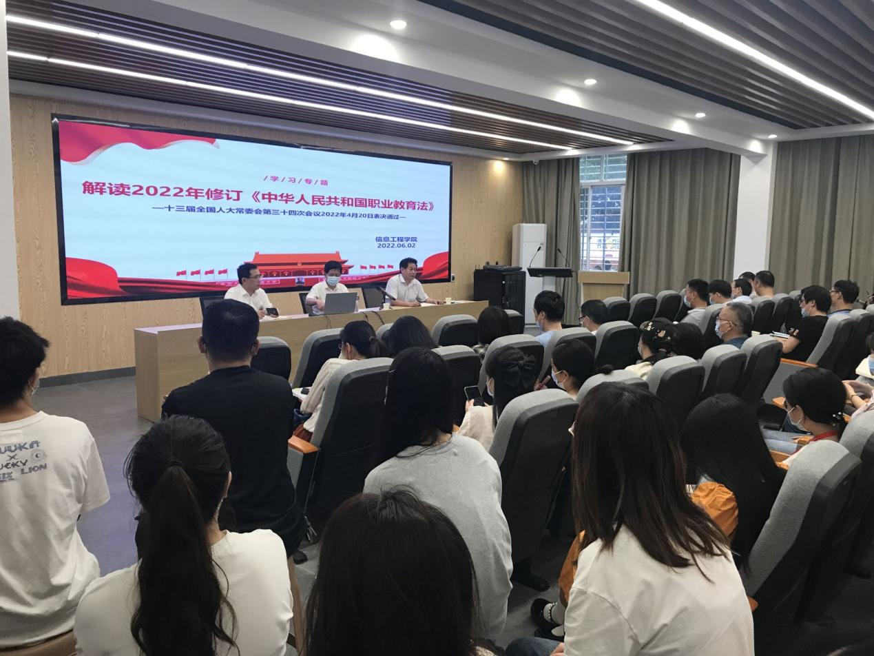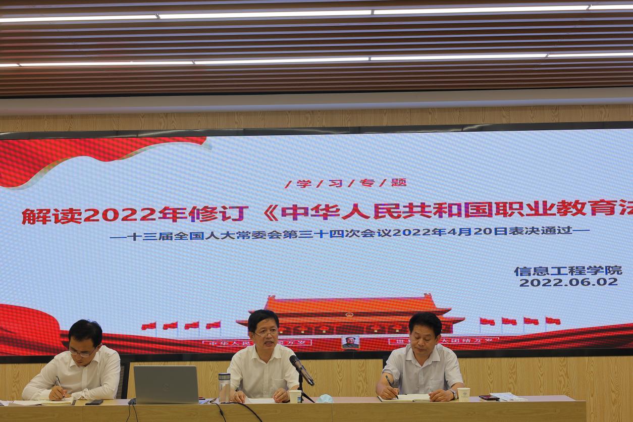 2022年6月2日,学校党委副书记、副校长王家绪为信息工程学院师生解读2022年修订的《中华人民共和国职业教育法》。信息工程学院党总支书记袁江顺、院长陈新文及学院全体教师和部分学生代表参加了会议。
