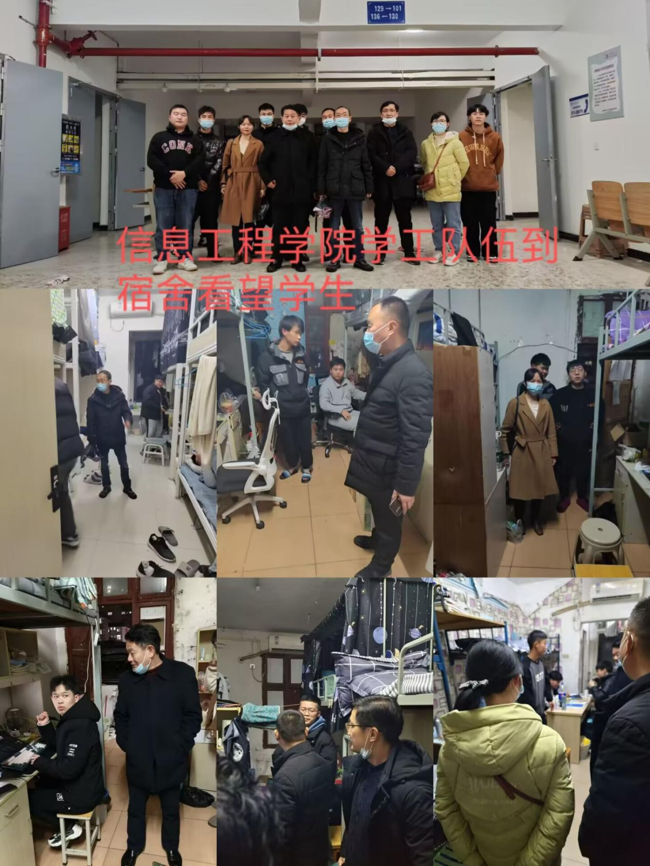 2023年2月12日,为深入了解我院学生返校情况,做好学生日常管理、安全稳定工作,切实把学院疫情防控工作做细做实,信息工程学院党总支书记袁江顺带领学院学工队伍深入走访学生宿舍,看望已返校的学生。