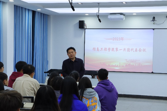 2023年3月23日晚上,信息工程学院第一次团代表大会在三号楼E508举行。学院党总支书记袁江顺、院长陈新文、院团总支书记陈丽娟、专职辅导员王利洋及学院55名团员代表参加了会议。大会由陈丽娟主持。