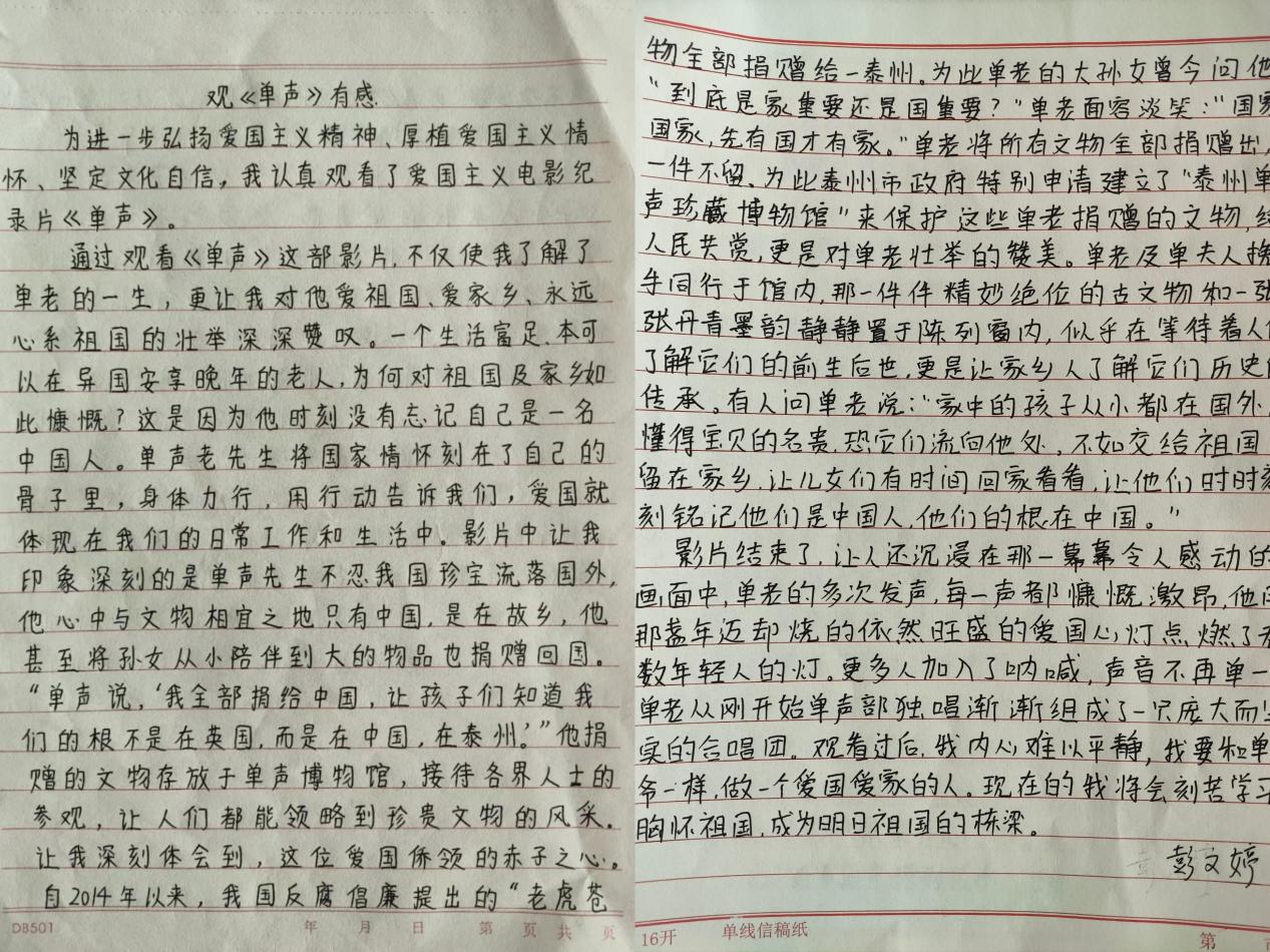 观影结束后,大家被单声先生崇高的爱国主义情怀所打动,互相交流观影体会,字里行间中都是生在中国、长在中国的自豪感与幸福感。同学们纷纷表示,将以单声老先生为榜样,厚植家国情怀,在今后的学习生活中不忘初心、牢记使命,以更加饱满的热情和昂扬的斗志投入学习。