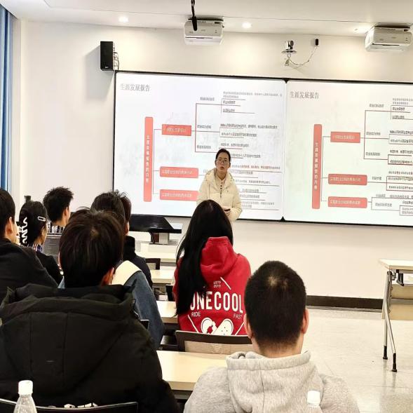 在活动中,陈老师凭借丰富的经验和深入的见解,向同学们阐述了职业生涯规划对于个人成长与未来发展的重要性。她系统地梳理了参赛作品在内容架构、逻辑条理等方面应遵循的原则,强调 PPT 不仅要美观大方,更要精准清晰地传达规划核心内容。陈老师通过生动的案例与实用的技巧分享,深入浅出地教导同学们如何将自身的职业愿景与实际行动紧密结合,打造具有竞争力的参赛作品。