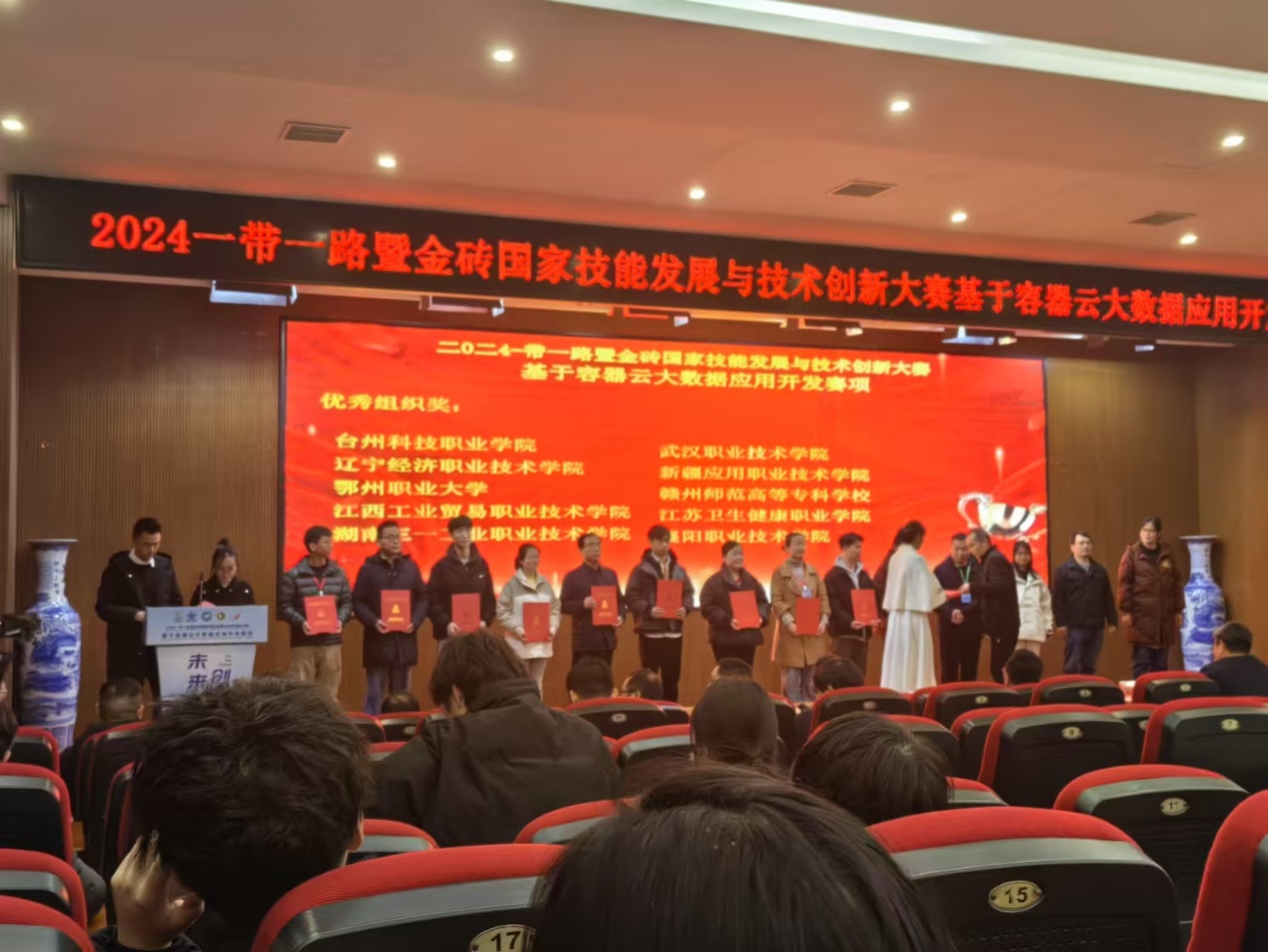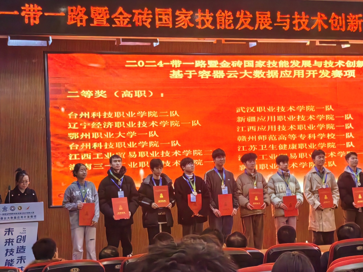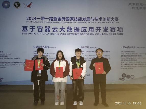 2024 年 12 月 15日-16 日,“一带一路暨金砖国家技能发展与技术创新大赛-基于容器云大数据应用开发赛项”全国总决赛在江西赣州开赛,来自全国近100支队伍近300名全国精英参赛,信息工程学院学生曾俊豪、裴锦程、周琪组成的代表队荣获全国总决赛“银牌”(全国二等奖),鄂州职业大学获优秀组织奖,指导老师陈新文获优秀组织奖;在2024年“深育杯”全国网络安全大赛在常州举行,来自全国本、专科学校近5000名学生参加角逐,信息工程学院学生李粤、肖可欣分别荣获一、三等奖,李粤获5000元奖金。