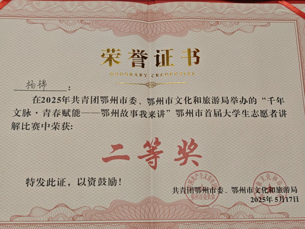 5月17日,由共青团鄂州市委、鄂州市文化和旅游局主办,鄂州市博物馆承办,长江职业学院、湖北幼儿师范高等专科学校、鄂州职业大学协办的“鄂州故事我来讲”首届大学生志愿者讲解比赛中,我院2023级计算机应用技术2班杨锦同学荣获二等奖。