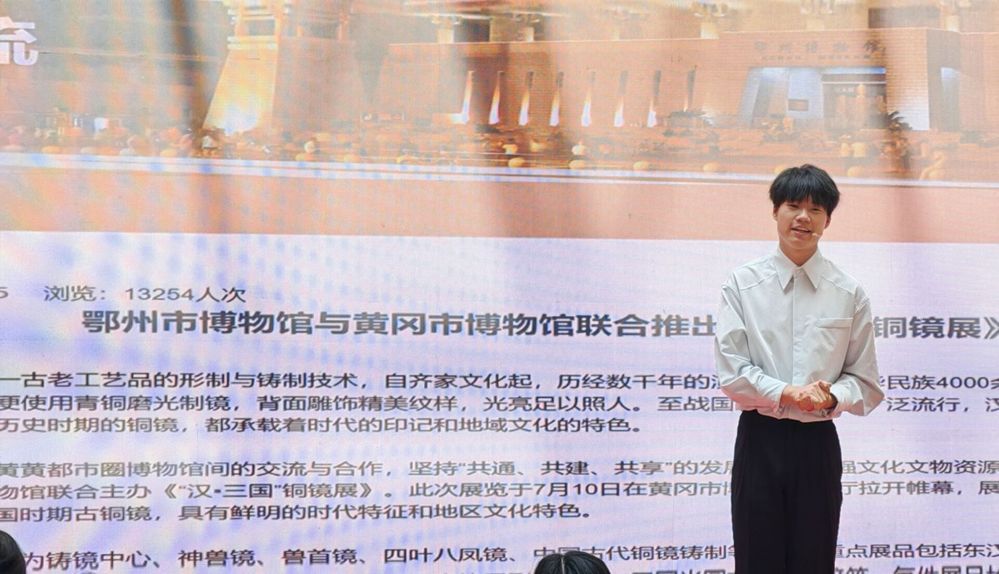 杨锦同学以“镜鉴千年映吴都——鄂州东汉兽首镜的文明密码”为题,深入解读了鄂州博物馆东汉兽首镜的文化价值。他通过古籍查询,生动形象的展现了这枚铜镜精妙绝伦的铜锡铅工艺,并以其背面的宜侯王的铭文篆书为切入点,串联起青铜铸造技艺的千年传承。在讲解中,他不仅阐述出通过3D打印技术让兽首文化在数字展厅中活了过来,更结合鄂州三国文化底蕴,阐述了铜镜作为文明载体的特殊意义——既见证着古代鄂州“冶铜之都”的辉煌历史,又折射出长江文明兼容并蓄的精神内核。他将科技手段与人文解读完美融合,为文物注入了新时代的活力,得到了评委的一致好评。