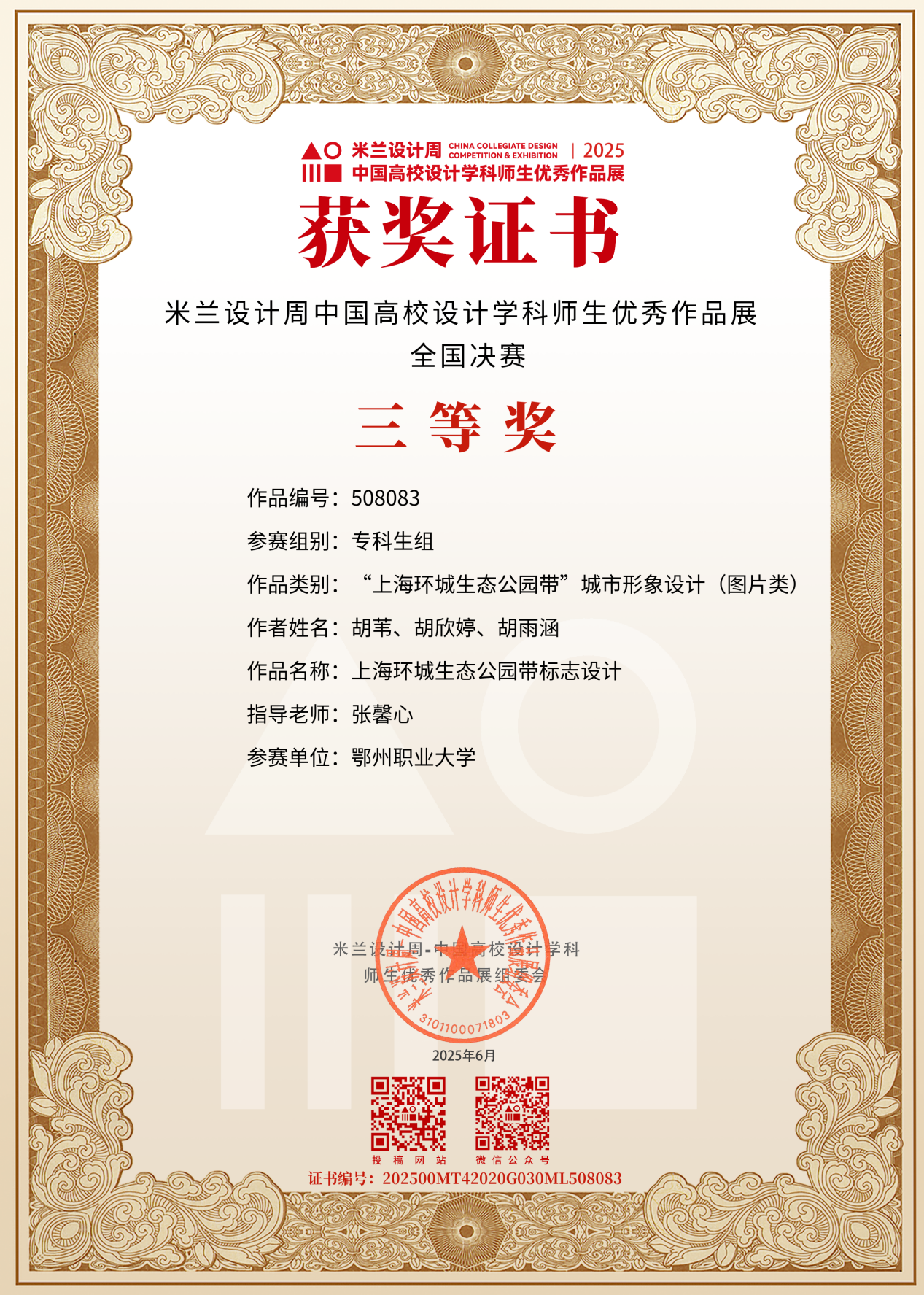 近日,在“米兰设计周中国高校设计学科师生优秀作品展——全国决赛”中,信息工程学院动漫制作技术专业学生胡苇、胡欣婷、胡雨涵凭借作品《上海环城生态公园带标志设计》荣获全国三等奖,指导教师为张馨心。