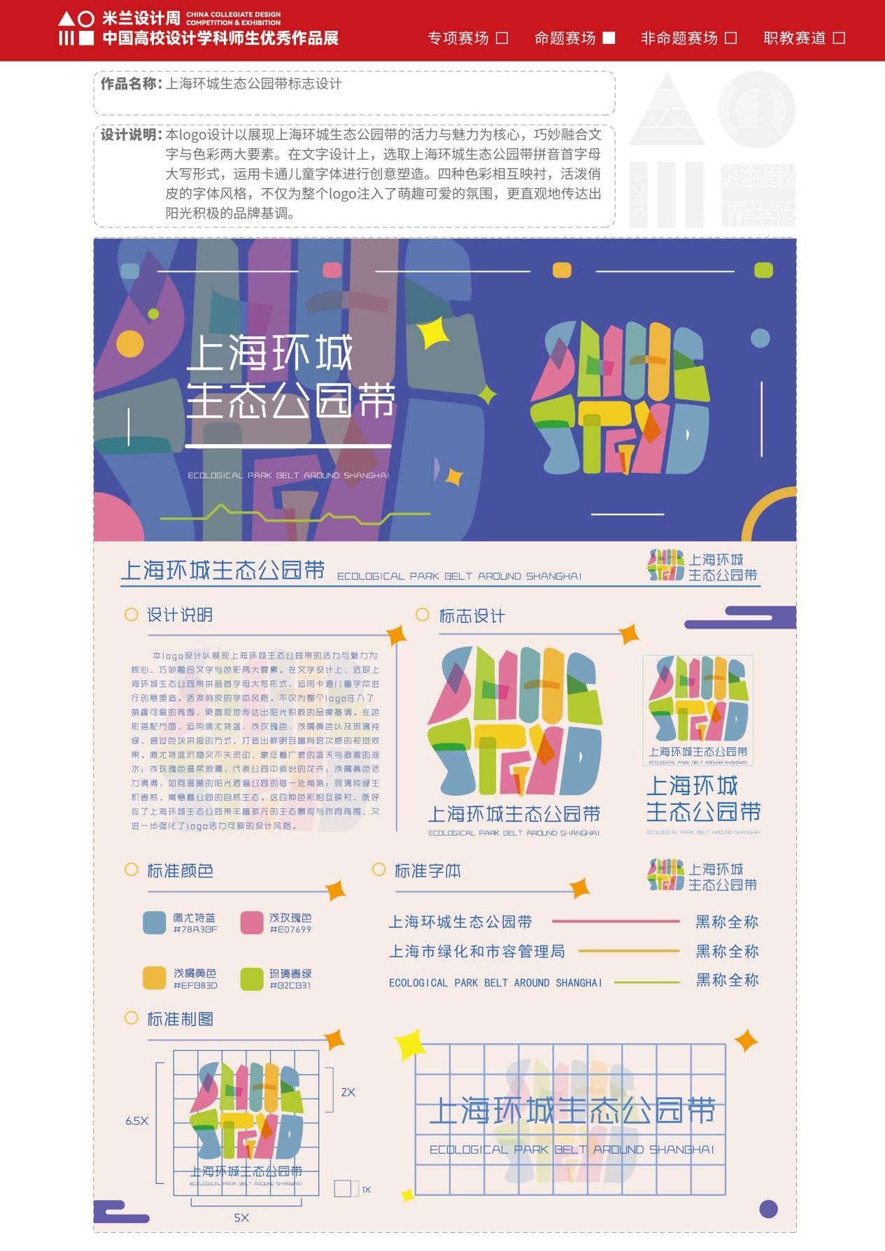 该作品以展现上海环城生态公园带活力为核心,提取拼音首字母进行创意设计。运用卡通儿童字体与撞色搭配,塑造出活泼俏皮风格,传递阳光积极的品牌基调,用视觉符号诠释生态特色与文化内涵,彰显学生专业功底与创新思维。