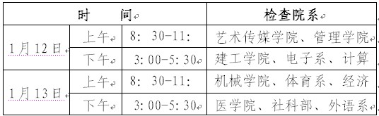 2.学校检查。2014年1月12—13日,学校期末教学检查组到各院系(部)听取期末教学自查情况汇报,以现场查看、座谈、问询等方式进行检查。