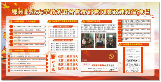 根据《中共鄂州职业大学委员会印发<鄂州职业大学第二十个党风廉政建设宣传教育月活动方案>的通知》文件要求,教务联合党支部5月份开展了为期一个月的党风廉政建设宣传教育月活动。本活动以“深入学习党章党规党纪和监察法,自觉践行‘两个维护’为主题,教育和引导支部党员、职工廉洁履职、廉洁从政,有力推动支部反腐倡廉的建设,取得良好效果。