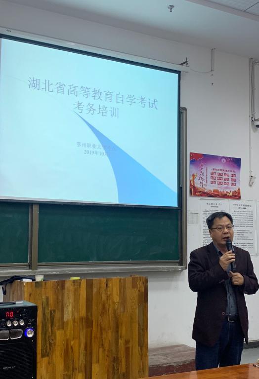 2019年10月17日下午,我校召开了考务会,对监考老师、后勤、保卫人员进行考前培训,本次考前培训得到市教育局及校领导高度重视,副校长胡海平同志、继续教育学院书记黄实同志分别发表重要讲话,提高各位考试相关人员思想认识、抓好考风考纪、掌握考试程序、熟悉考试业务,确保自学考试平稳顺利进行。本次自学考试在我校考点7012科,54个考场,继续教育学院副院长刘军对各位老师进行考前培训,并强调几个考试时间的重要节点,以及容易发生的失误,要求老师们严格遵照各项规定和工作程序,认真完成好本职工作。最后,继续教育学院书记黄实同志强调今年是湖北省自学考试新旧专业转接的重要阶段,为了考生能顺利毕业,提高瓶颈课程合格率,可采用学分互认的方式进行转接,同时可参加我校自学考试服务中心的网络助学。