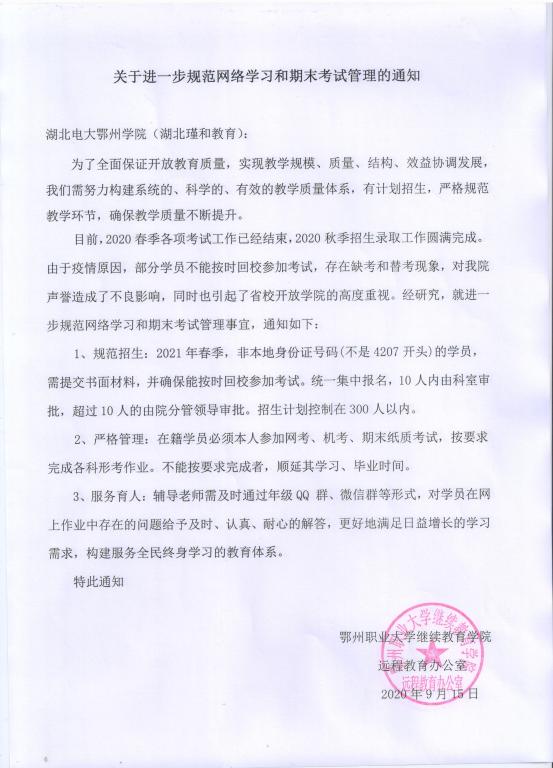 目前,2020春季各项考试工作已经结束,2020秋季招生录取工作圆满完成。由于疫情原因,部分学员不能按时回校参加考试,存在缺考和替考现象,对我院声誉造成了不良影响,同时也引起了省校开放学院的高度重视。经研究,就进一步规范网络学习和期末考试管理事宜,通知如下: