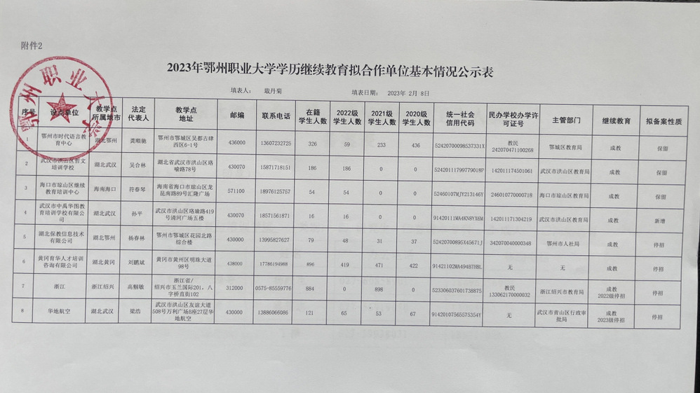 根据2023年第2次校长办公会会议要求,现将2023年鄂州职业大学学历继续教育拟合作单位情况公示如下: