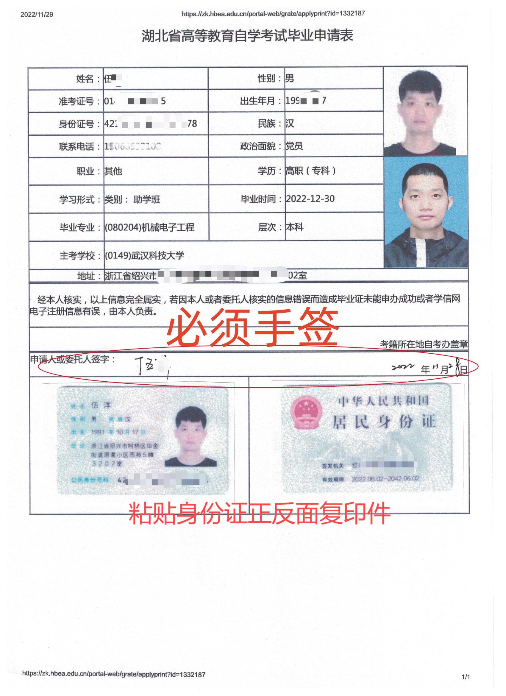 1、《湖北省高等教育自学考试毕业申请表》、身份证复印件(直接粘贴在申请表的相应区域) 1份(见样表1)
