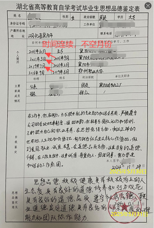 4、思想品德表的图片开网申请时要上传至毕业申请的页面,否则毕业申请不成功。毕业生思想品德鉴定表每项必填,自我鉴定应由考生本人用黑色中性笔填写,考生本人签名,单位鉴定必须是上班单位手签意见并盖章,无工作单位的可由户籍所在地或居住地居委会(村委会)手签意见并盖章。毕业生自我鉴定应体现正确的思想认识,语句通顺,无错别字及标点符号错误。考生个人简历的填写必须规范,个人简历应更新至当前时间,最多填写六条经历,按时间顺序从近至远排列,确保时间线连贯无断层。若无工作经历,可填写“待业”或“自由职业”。若审核时发现存在上述问题,审核时会被驳回修改。
