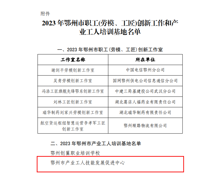 近日,学校工会2023年申报的鄂州市产业工人培训基地通过评选,我院被鄂州市总工会授予命名鄂州市产业工人培训基地,全称“鄂州市产业工人技能发展促进中心”。