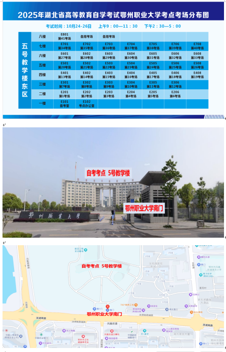 (1)考点地址:鄂州市鄂城区凤凰路78号鄂州职业大学东区南门5号楼。