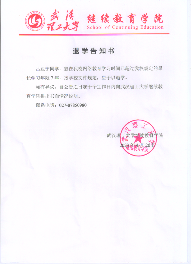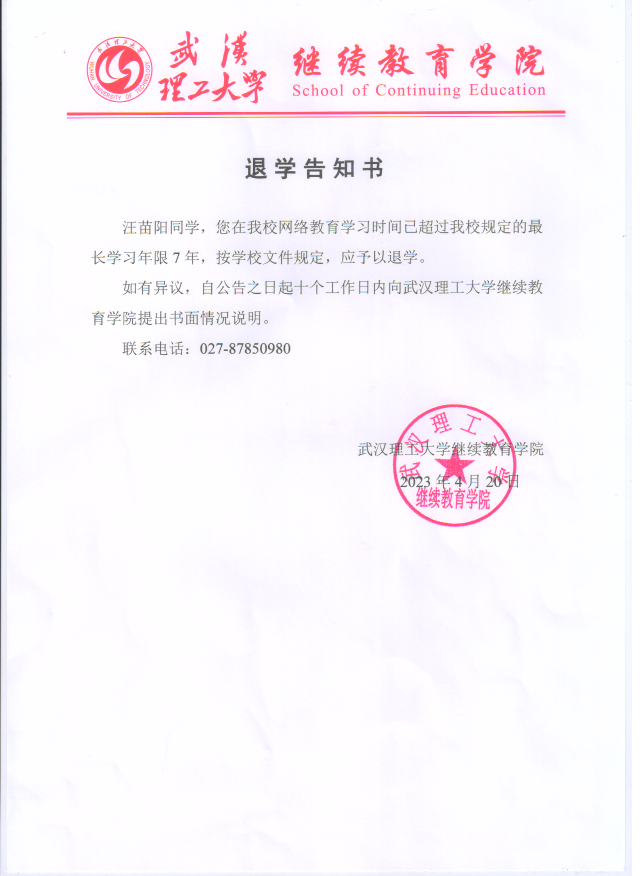 汪苗阳和吕亚宁两位同学因超过武汉理工大学继续教育学院规定的最长学习年限7年,予以退学。如有异议,自公告之日起十个工作日内向武汉理工大学继续教育学院提出书面情况说明。