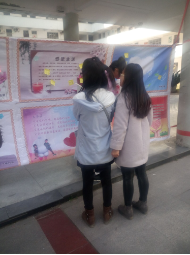 活动以“感恩生活,从心开始”为主题,各班积极踊跃的参加,大家集思广益,表现出来的作品,各似各样、异彩纷呈,各院系领导以及同学们给予极高的评价,前来观赏的同学络绎不绝,彼此用便利贴写下了自己的寄语。