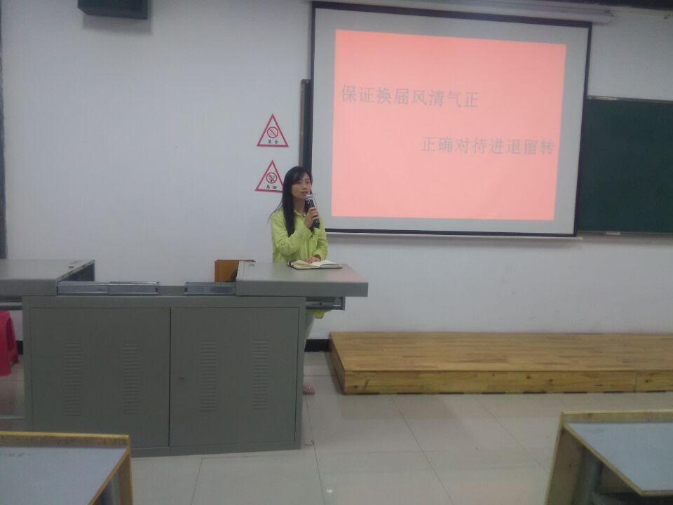 2016417号下午六点,在机械综合楼jx409教室召开了“风清气正换届,严于律己做人”的团学代会换届筹备暨纪律强调会。团总支书记王景秋主持,14级学生会全体干部及15级学生会干事和各班班长参加。