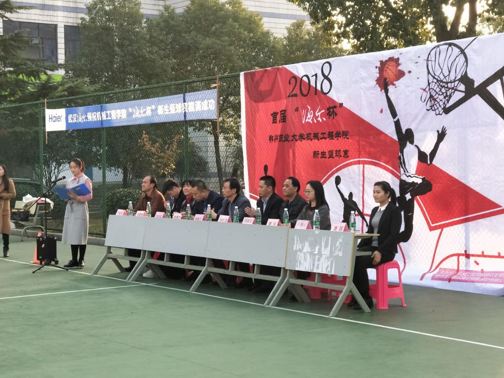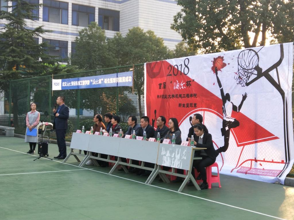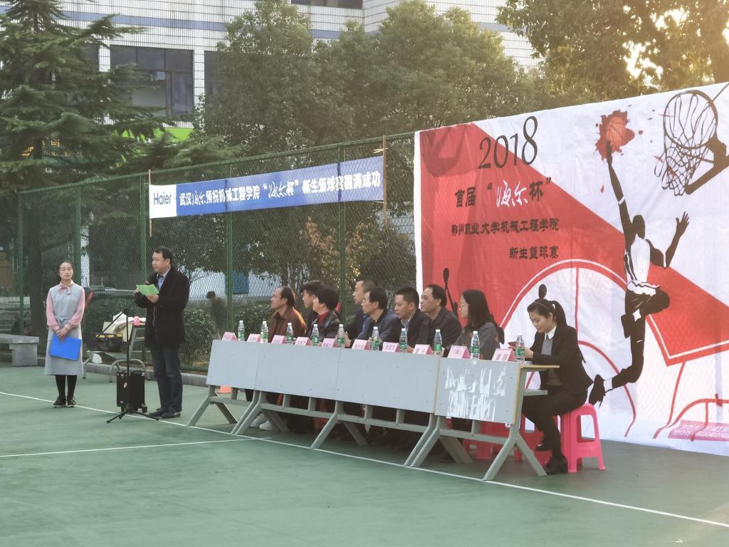 2018年11月26日下午16时,天气晴朗,在温暖阳光的照射下,机械工程学院首届“海尔杯”新生篮球赛开幕啦!我院院长熊裕文,院党总支书记刘宏文为首的院领导班子成员全部参加了开幕式,参加开幕式的还有武汉海尔电器股份有限公司海尔中南大区创客中心人力资源李红国部长,武汉空调互联工厂姜勇功部长等一行七位企业领导,开幕式由团总支书记王景秋主持。