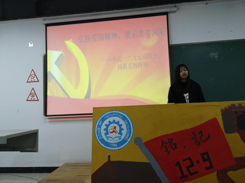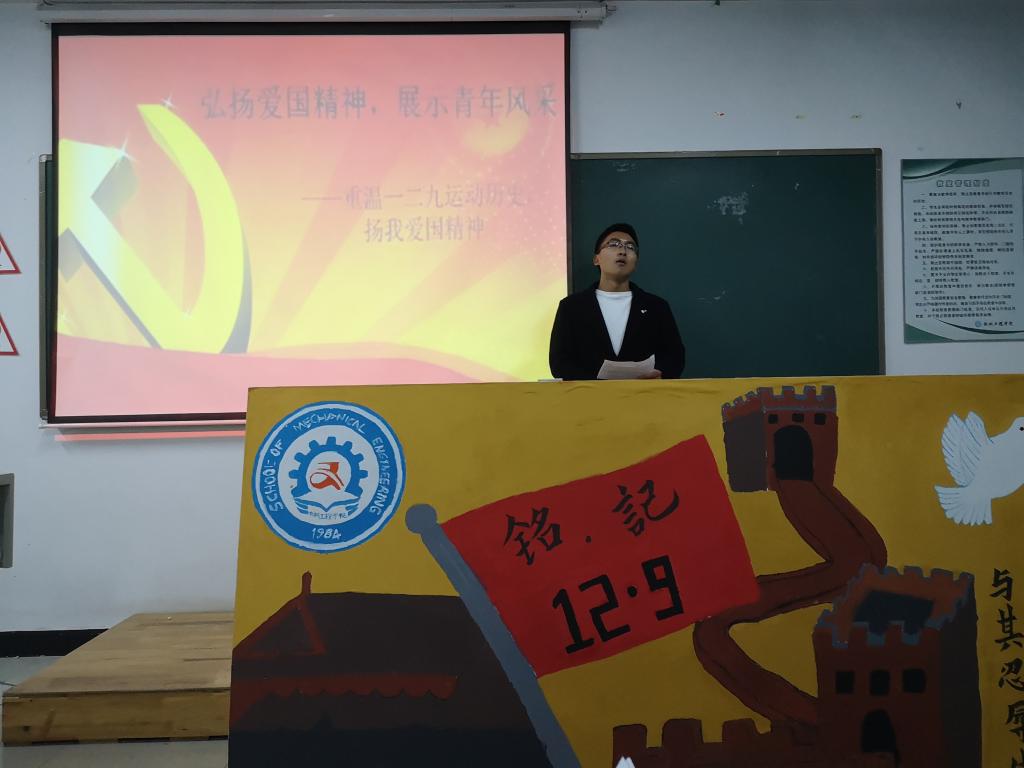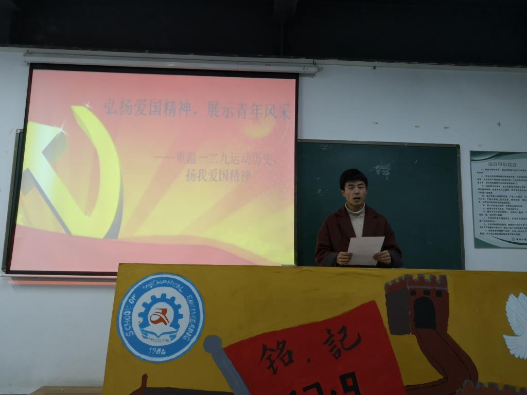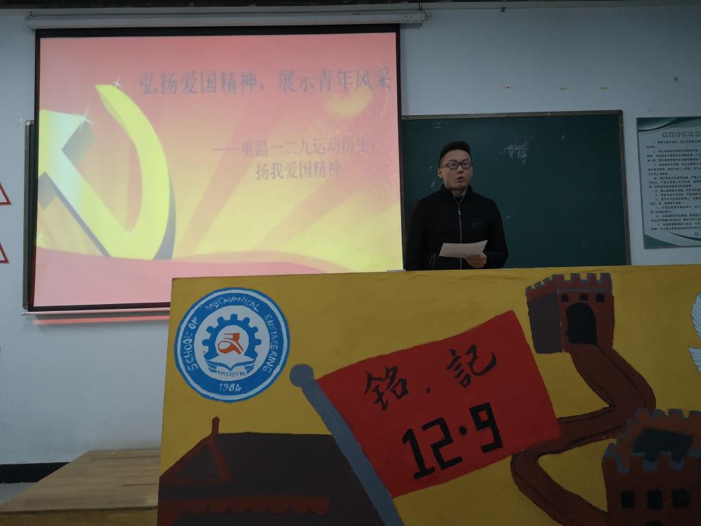 为全面贯彻落实党的十九大精神,坚持以习近平新时代中国特色社会主义思想为指导,深入学习习近平总书记重要讲话精神,纪念“一二·九”学生爱国运动83周年,引导广大青年学生牢记历史使命,坚定理想信仰,号召广大青年学生积极投身于社会主义现代化建设的伟大实践中,为实现中国梦而努力奋斗,12月9日晚,我院团总支在机械综合楼409教室举行纪念“一二·九”学生爱国运动演讲比赛。院团总支书记王景秋,辅导员曾丹老师出席此次比赛,学院学生会干部担任评委。