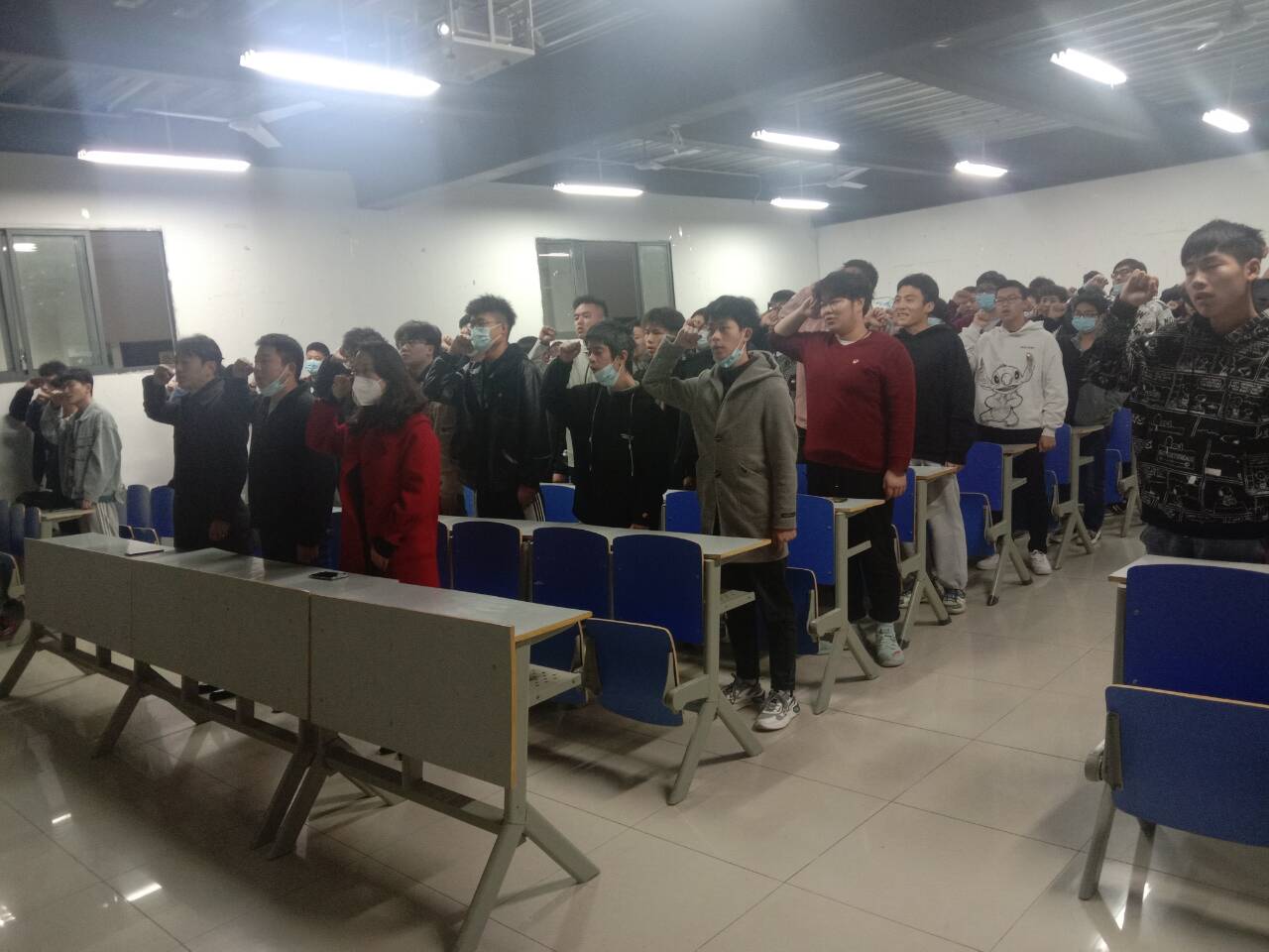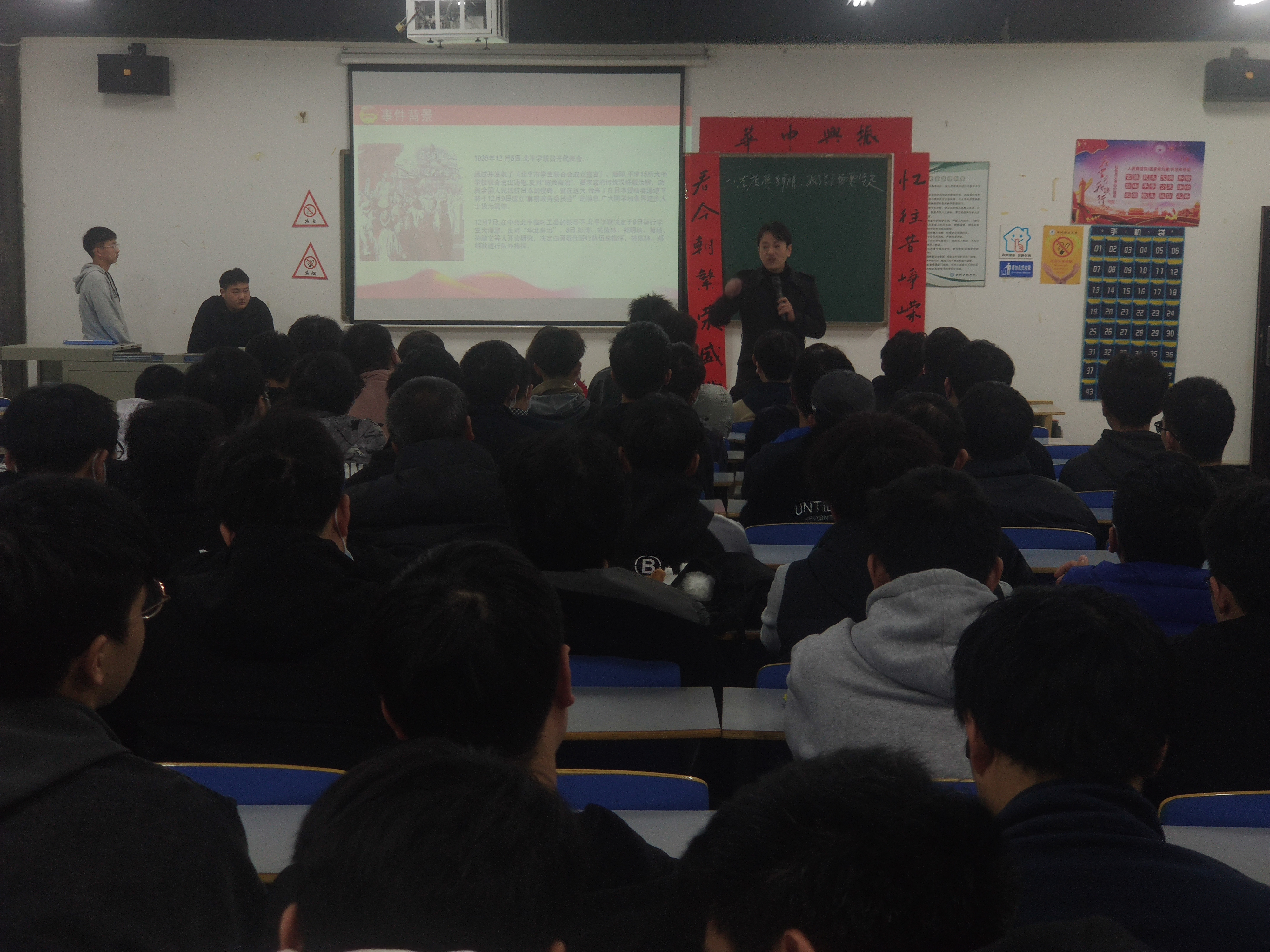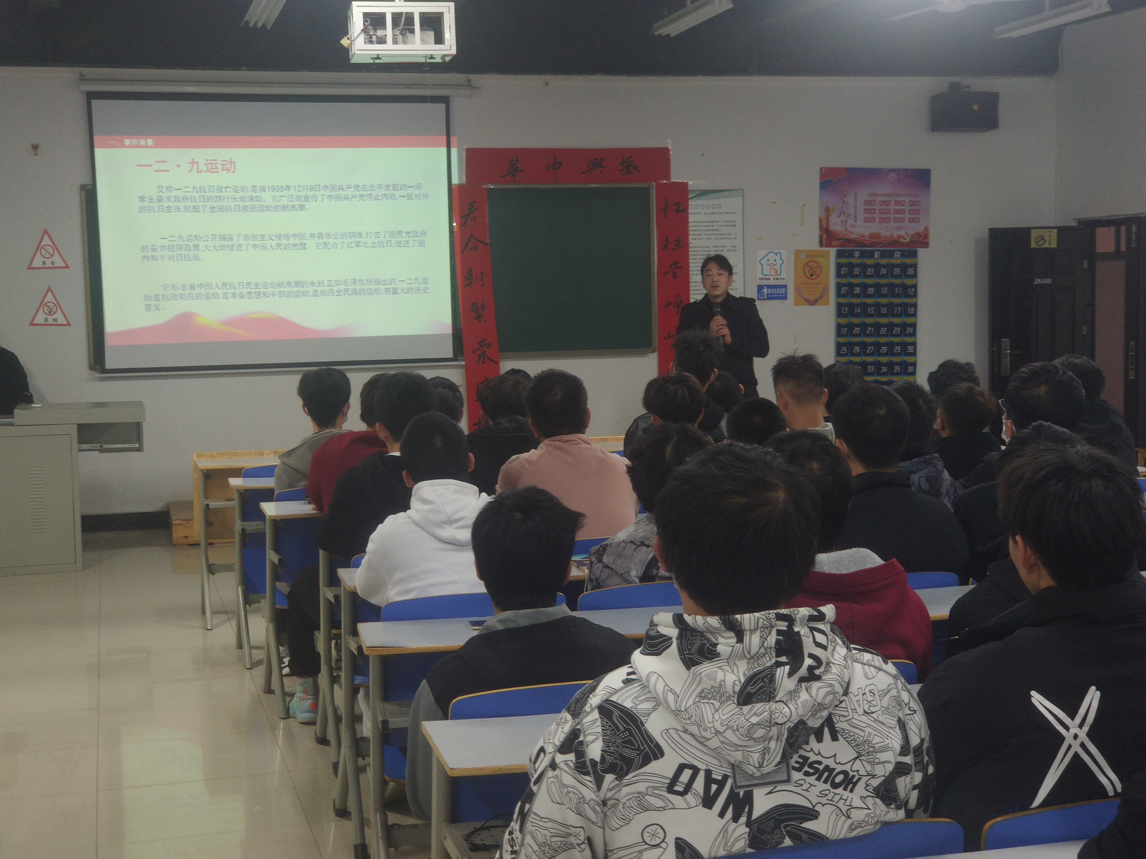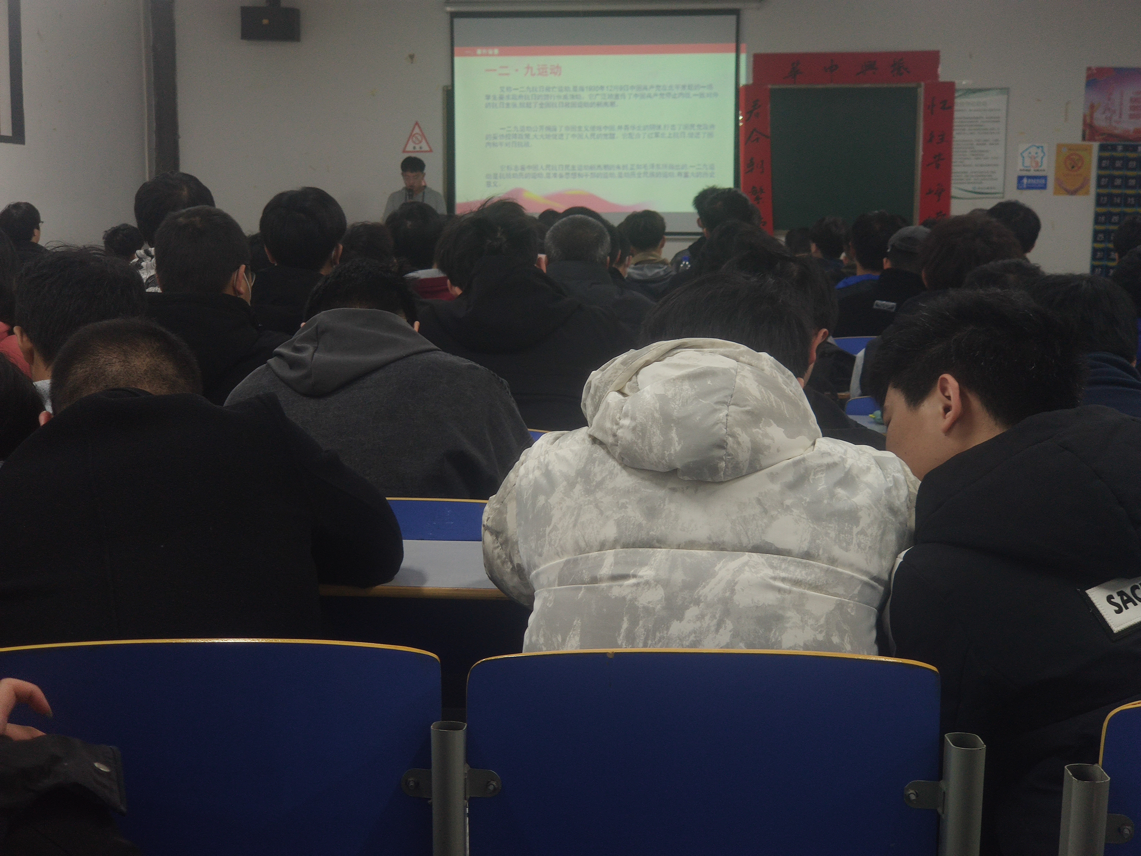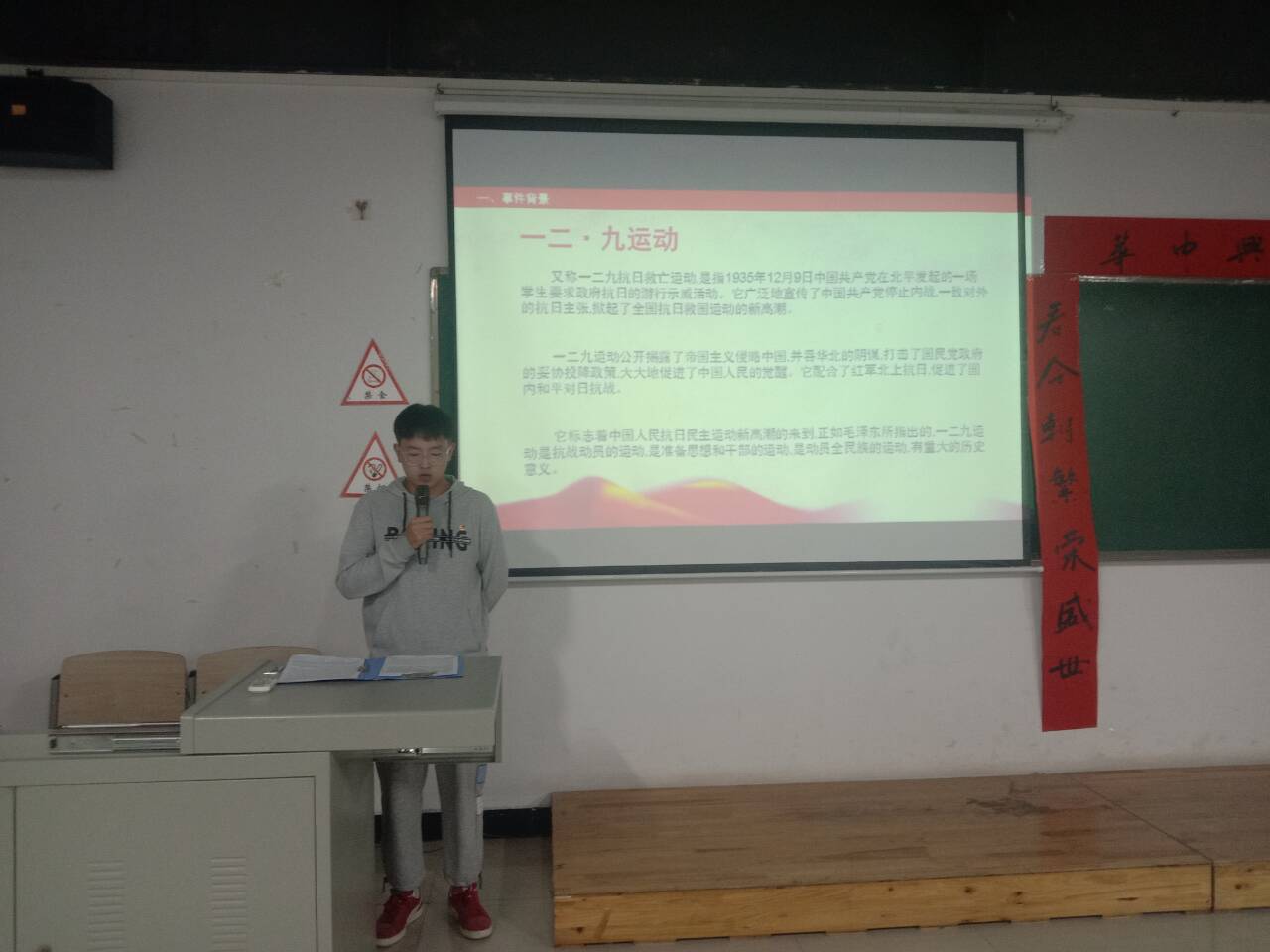 宣誓完后同学们坐姿端正, 由团总支副书记黄启洲主持,带领团员青年们重新回顾了那段激情澎湃的历史。认真听着由黄启洲学长讲述一二九发生的时间、背景、过程、结果、口号、意义,让我们了解“一二九"那段让人难忘的历史,让同学们认识历史与现实,感悟大学生的爱国意精神,达到在新的历史时期爱国的目的。