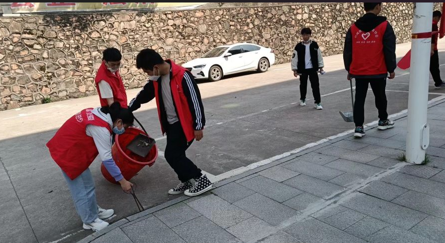 志愿者们提前到达集合地点,分发劳动工具。师生同框拉起袖子说干就干。通过大家的辛勤劳动,落叶、尘土、烟头和杂物都清扫的干干净净。