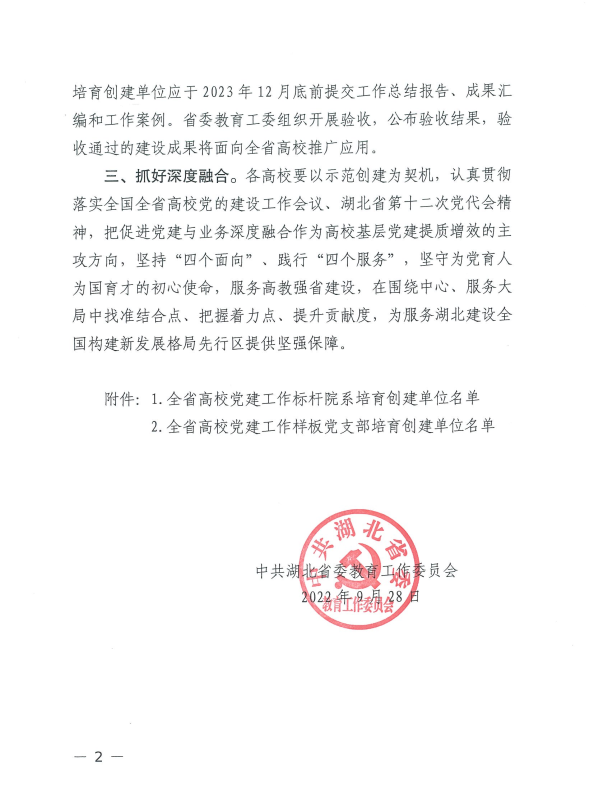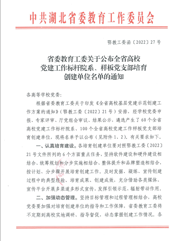 近日,中共湖北省委教育工作委员会发文公布了2022年湖北省高校党建工作样板党支部培育创建单位名单,鄂州职业大学机械工程学院教工第三党支部入选。