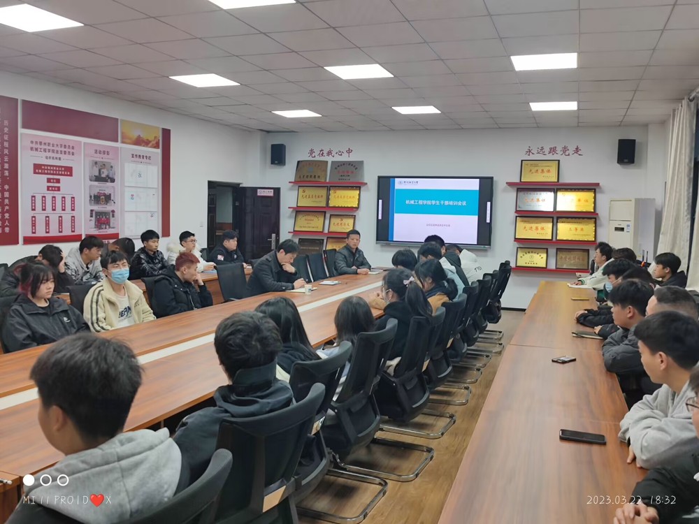 为进一步发挥学生干部先锋模范带头作用,提高学生干部政治素养和工作能力,推动我院学风建设月活动。3月22日晚18:00,在机械楼三楼会议室召开机械工程学院2023年度学生干部第二次培训会。我院党总支副书记龚伟、团总支书记周艳艳、辅导员曾丹及全院班长、学习委员参加本次培训会。