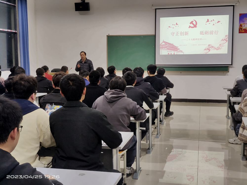 为深入学习贯彻党的二十大精神,425日晚,在汽车实训中心208多媒体教室,机械工程学院党总支书记李怀功作题为《守正创新 砥砺前行》的主题宣讲报告,报告会由学生党支部书记徐波主持,学院全体学生党员和入党积极分子参加此次报告会。