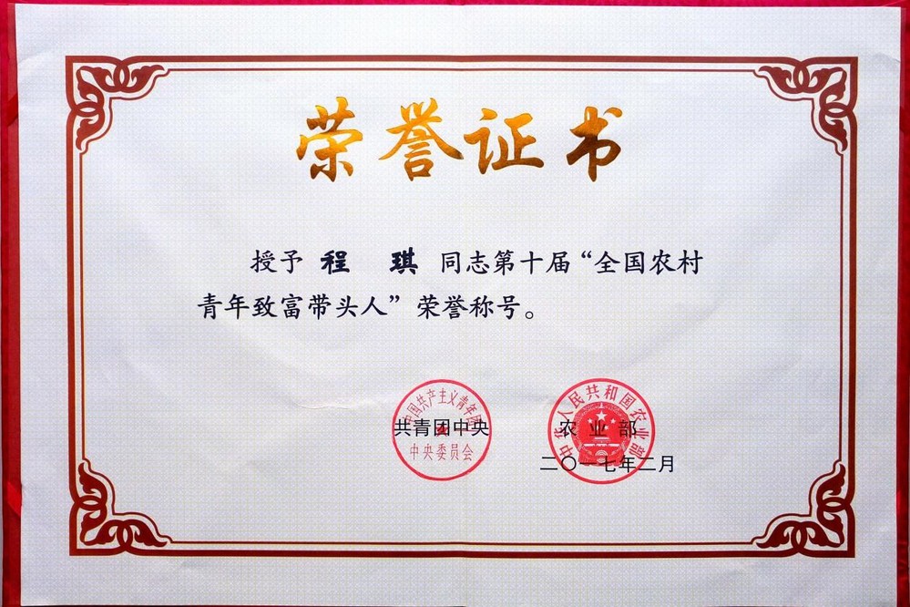 曾获:全国乡村振兴青年先锋、全国农村青年致富带头人、第三届“创青春”中国青年创新创业大赛铜牌,湖北省青年拔尖人才、省优秀共产党员、省青年五四奖章、荆楚楷模、省科学技术进步三等奖、省脱贫攻坚先进集体等荣誉。