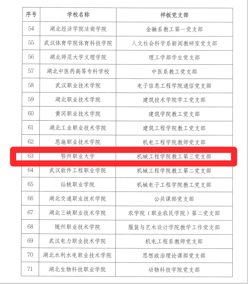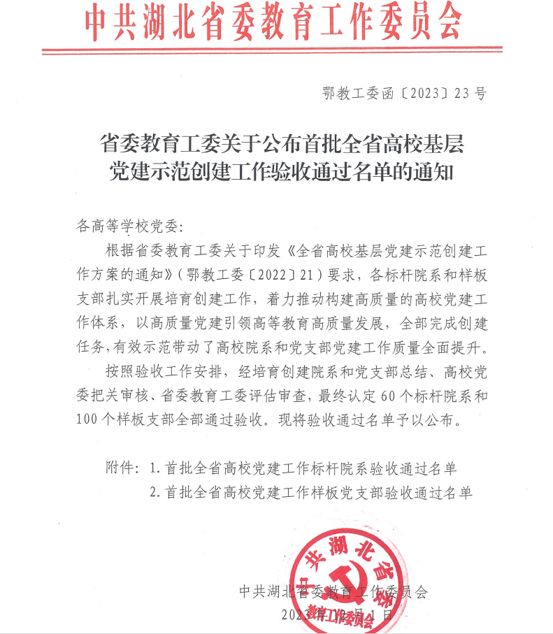 (通讯员 龚伟)12月1日,湖北省委教育工委发布了《首批全省高校基层党建示范创建工作验收通过名单的通知》,我校机械工程学院教师第三党支部顺利通过验收。