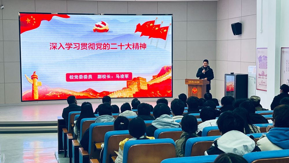 马凌军从党的二十大召开的背景、召开的主题和主要成果等十个方面,对深入学习贯彻党的二十大精神作了深入浅出的分析与解读,并结合学校实际,就如何学习贯彻二十大报告精神提出了具体的要求,为青年学生如何在全面建设社会主义现代化国家贡献青春力量方面指明方向。