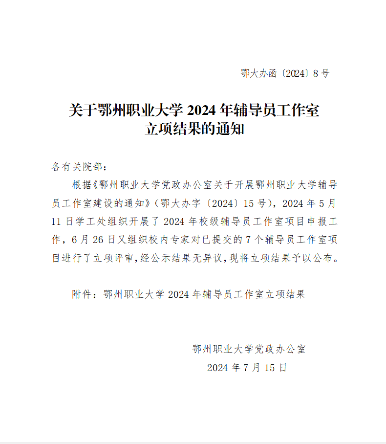 近日,学校党政办印发《关于鄂州职业大学2024年辅导员工作室立项结果的通知》,机械工程学院“匠心智造”校企合作职业能力培育辅导员工作室项目获批校级辅导员工作室立项,建设期两年。