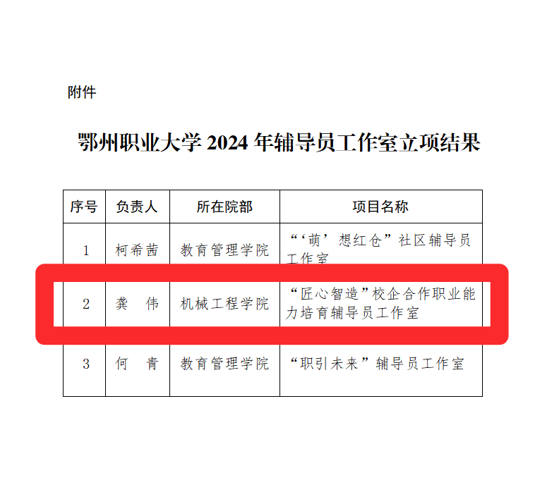 近日,学校党政办印发《关于鄂州职业大学2024年辅导员工作室立项结果的通知》,机械工程学院“匠心智造”校企合作职业能力培育辅导员工作室项目获批校级辅导员工作室立项,建设期两年。
