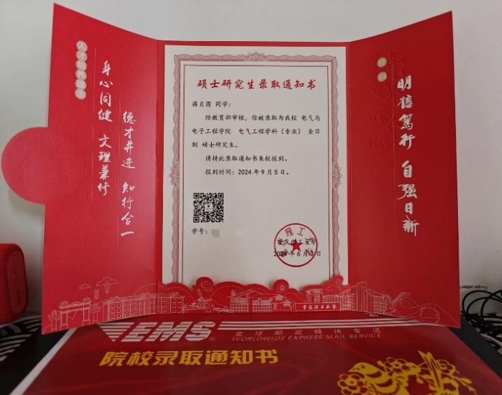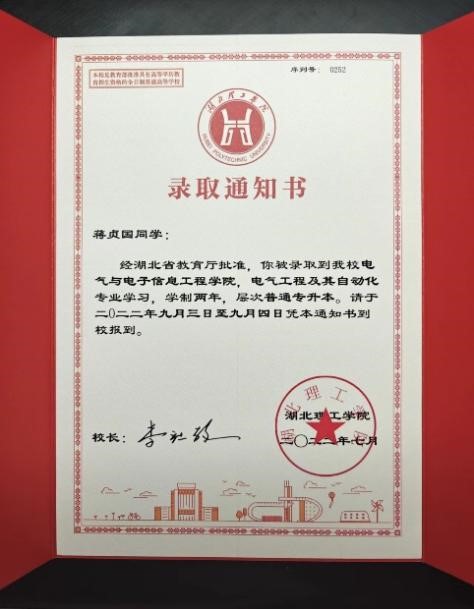 2019年高考,蒋贞国以353的高考成绩考入鄂州职业大学机械工程学院机电一体化技术专业学习,2022年通过湖北省“专升本”考试考入湖北理工学院进行两年的本科学习。在本科学习过程中,他又立志考研,最后成功考取了重庆理工大学电气工程专业硕士研究生。