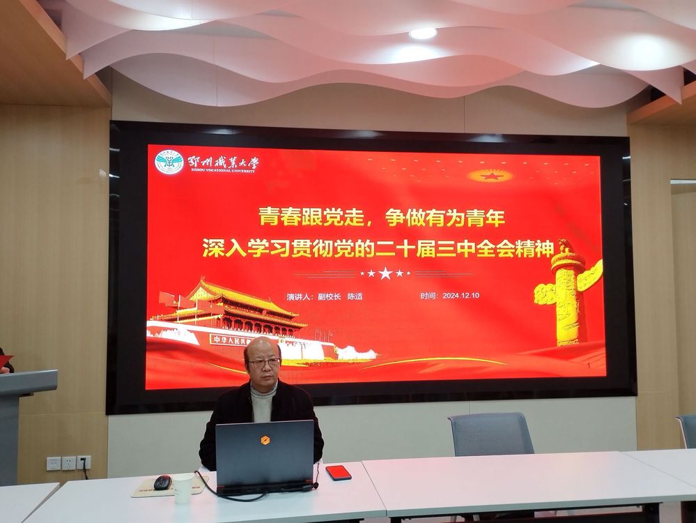 陈适主要围绕深刻领会党的二十届三中全会精神的核心要义、将党的先进理论转化为推动我们学校高质量发展的实际行动、青春跟党走,争做有为青年等三个方面,对深入学习贯彻党的二十届三中全会精神作了深入浅出的分析与解读,并结合学校实际,就如何学习贯彻党的二十届三中全会精神提出了具体的要求,为青年大学生如何在全面建设社会主义现代化国家贡献青春力量方面指明方向。